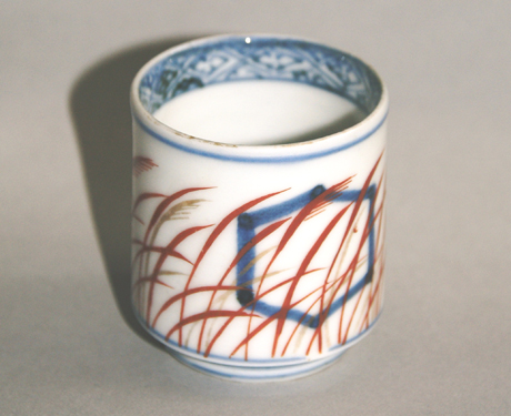 猪口と言うには少し小さいが、今のお猪口と同じ使い方が出来る。杯とは薄い、平たい「さかつき」を言う。本品の絵は手描き。赤色と金彩(少し薄く消えている)のススキで秋を表現し、それに青色の六角形を雪(六華)を雑に描いてやがて来る冬を思わせている。意匠として面白い。